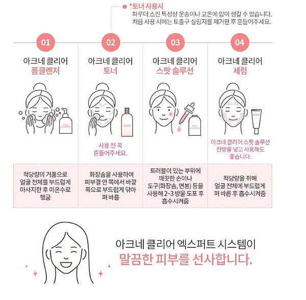 使用順續:去痘清潔慕斯=>去痘爽膚化妝水=>抗痘spot solution=>清除粉刺seurum
